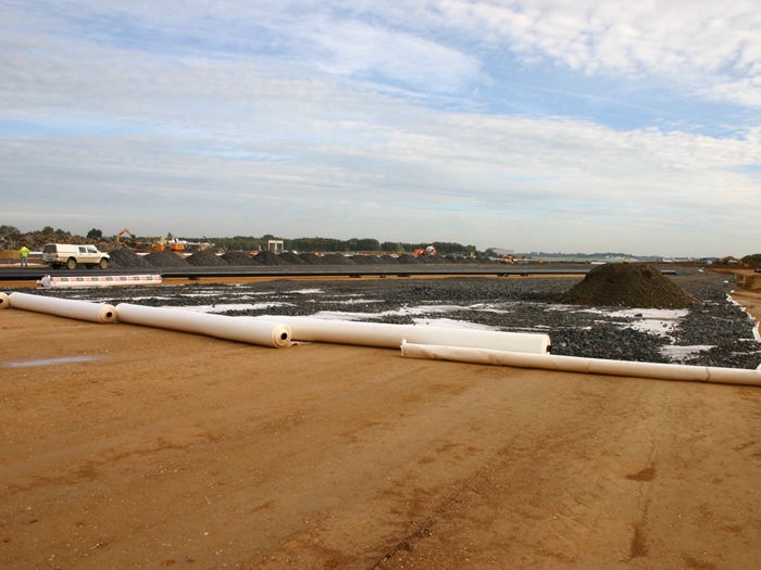 e)在綿軟路基上工程施工時(shí),應(yīng)將焊機(jī)頭頂部稍微拉高或鋪裝一層層1mm厚HDPE土工膜做墊襯,防止焊機(jī)行駛?cè)^(guò)程中土壤被帶到電焊焊接部位,危害電焊焊接品質(zhì);