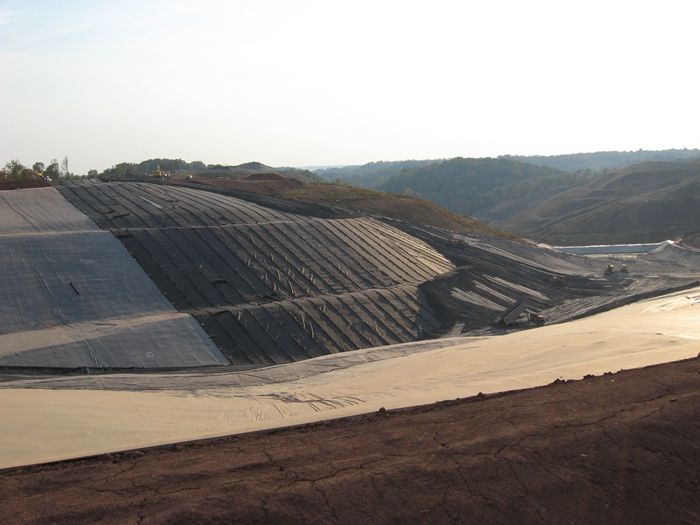 a、一、二卷光面HDPE防滲膜平行于較大線鋪設(shè),壓作在100m以上。